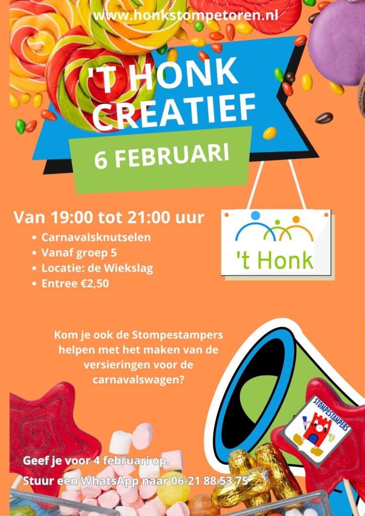 Tijdens ’t Honk Creatief op 6 februari gaan we van 19.00 tot 21.00 uur carnavalsknutselen 🎨✂️